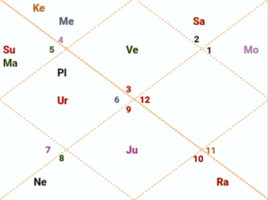 Her financial and celebrity gains, the fulfilment of her desires, are ultimately guaranteed by the Moon in Aries in the 11th House. The Moon, representing public popularity, in the pioneering sign of Aries, ensured her creative endeavors found mass appeal and popularity, swiftly translating into significant financial security.